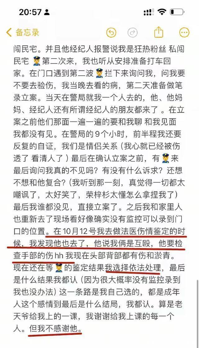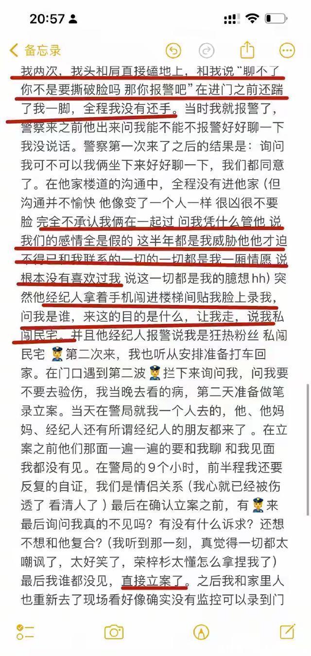 李禹熹真报了警,可荣梓杉面对民警瞬间戏精上身,咬死“根本不认识她,是她一厢情愿”。更让人心寒的是,荣梓杉的经纪人赶到后,反咬李禹熹是“私生饭私闯民宅”,甚至二次报警诬陷她。李禹熹无奈去警局立案,还晒出医院伤情诊断和报案回执。可荣梓杉方至今咬定“从未恋爱”,反控女方“长期骚扰”。