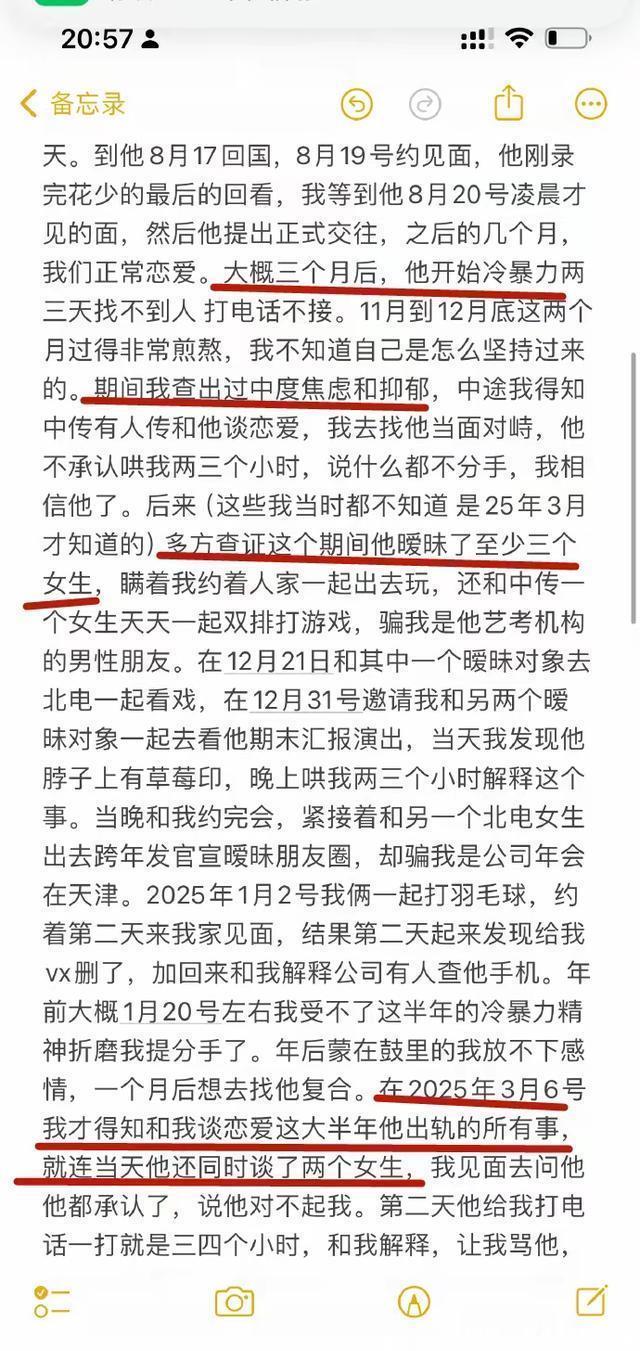 劈腿操作惊呆网友,期末演出同时邀约三女生 最让人目瞪口呆的是荣梓杉的劈腿操作!去年12月31日,他在学校办期末汇报演出,居然胆大包天到同时邀请李禹熹和另外两位暧昧对象到场看演出。 演出结束后,他先陪李禹熹吃饭,脖子上的草莓印被问起时,面不改色说是“剧组兄弟闹着玩”;转头又和北电女生跨年发暧昧朋友圈,被质问时竟脸不红心不跳地撒谎:“公司开年会!”